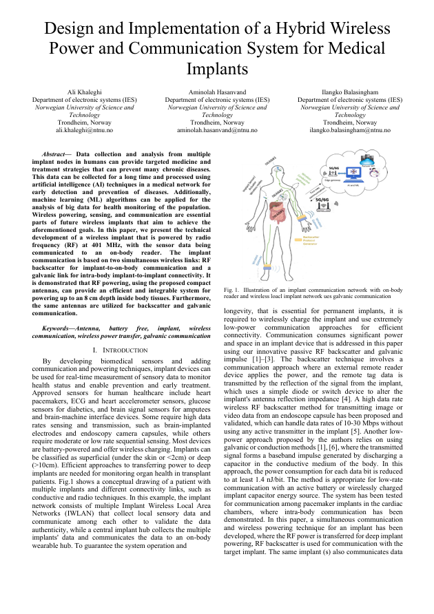A. Khaleghi, A. Hasanvand and I. Balasingham, “Design and Implementation of a Hybrid Wireless Power and Communication System for Medical Implants,” 2023 IEEE MTT-S International Microwave Biomedical Conference (IMBioC), Leuven, Belgium, 2023, pp. 52-54, doi: 10.1109/IMBioC56839.2023.10305096.