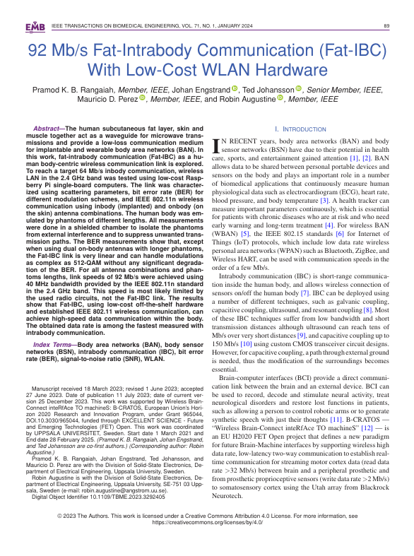 Rangaiah PKB, Engstrand J, Johansson T, Perez MD, Augustine R. “92 Mb/s Fat-Intrabody Communication (Fat-IBC) With Low-Cost WLAN Hardware”. IEEE Trans Biomed Eng. 2024 Jan;71(1):89-96. DOI: 10.1109/TBME.2023.3292405. Epub 2023 Dec 22. PMID: 37432837.
