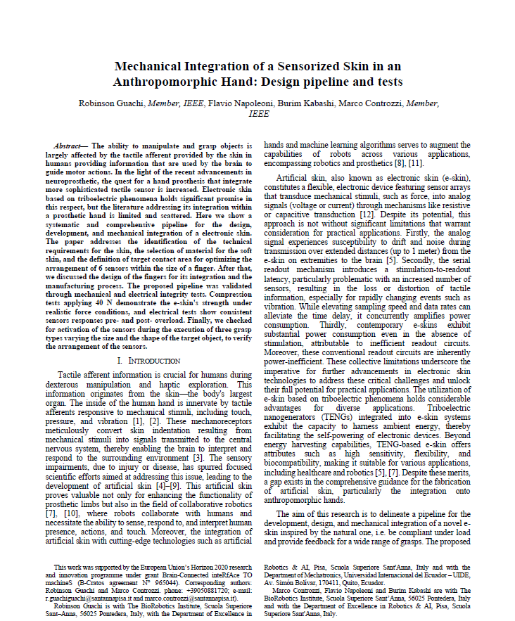 R. Guachi, F. Napoleoni, B. Kabashi and M. Controzzi, “Mechanical Integration of a Sensorized Skin in an Anthropomorphic Hand: Design Pipeline and Tests,” 2024 10th IEEE RAS/EMBS International Conference for Biomedical Robotics and Biomechatronics (BioRob), Heidelberg, Germany, 2024, pp. 345-351, doi: 10.1109/BioRob60516.2024.10719945