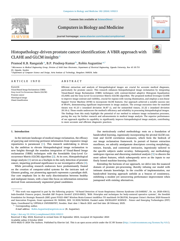 Rangaiah, Pramod K. B., B. P. Pradeep Kumar and Robin Augustine. “Histopathology-driven prostate cancer identification: A VBIR approach with CLAHE and GLCM insights.” Computers in biology and medicine 182 (2024): 109213 .