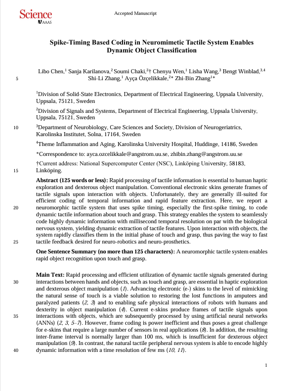 Chen, L., Karilanova, S., Chaki, S., Wen, C., Wang, L., Winblad, B., … Zhang, Z. (2024). Spike timing–based coding in neuromimetic tactile system enables dynamic object classification., 660–665. https://doi.org/10.1126/science.adf3708